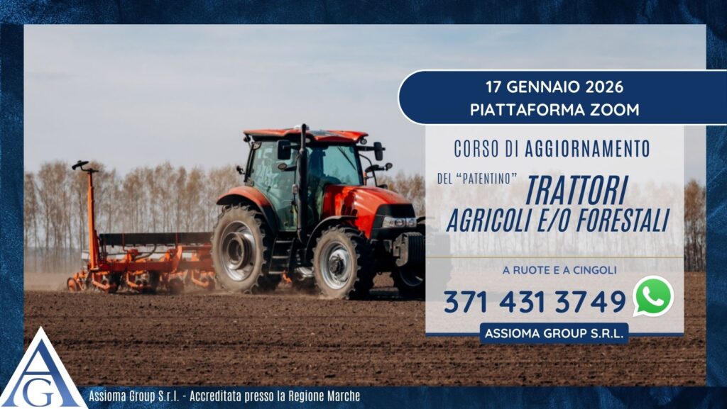 CORSO DI AGGIORNAMENTO DELL’ABILITAZIONE DEL PATENTINO DEI TRATTORI AGRICOLI L’ing. Pasquale iobbi della ditta Assioma Group S.r.l. organizza corsi per il conseguimento del “patentino” del trattore agricolo ed aggiornamento in conformità ai requisiti previsti dall’Accordo Stato Regioni del 22/02/2012. Al termine del corso, previo il superamento di un test di verifica ed una frequenza non…